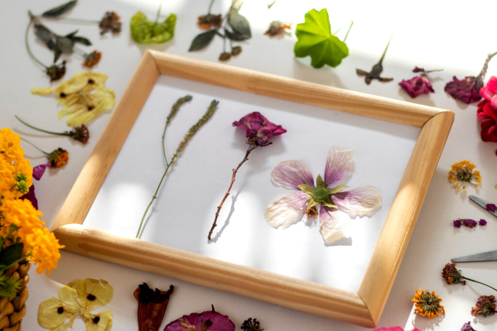 Das Pressen von Blumen ist eine Methode, die besonders für flachere Blumen wie Veilchen, Gänseblümchen oder kleine Rosen funktioniert. Du kannst deinen Brautstrauß damit zu einem schönen, flachen Andenken machen, das sich gut für Einrahmungen oder als Dekoration eignet.